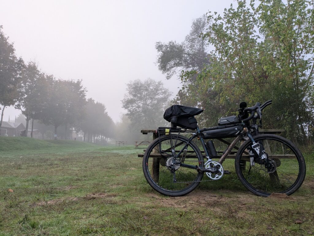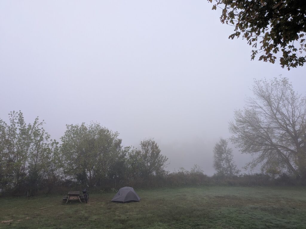 Je me suis bien gelé cette nuit et l’humidité est telle que tout est trempé comme s’il avait plu… Raté pour ne pas avoir une tente mouillée (ou une serviette sèche).
